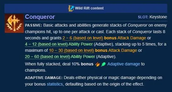 被动:对敌方英雄造成伤害的攻击或技能会提供适应之力的层数,最多叠加5层,持续8秒。在叠满层数后,你对敌方英雄造成额外的自适应伤害。