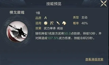 随机降低1名敌方武将50.0点防御,持续10秒,井对其造成107.5%武力伤害,技能冷却20秒