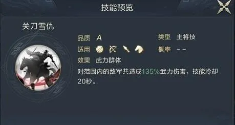 对范围内的敌军共造成135%武力伤害,技能冷却20秒。