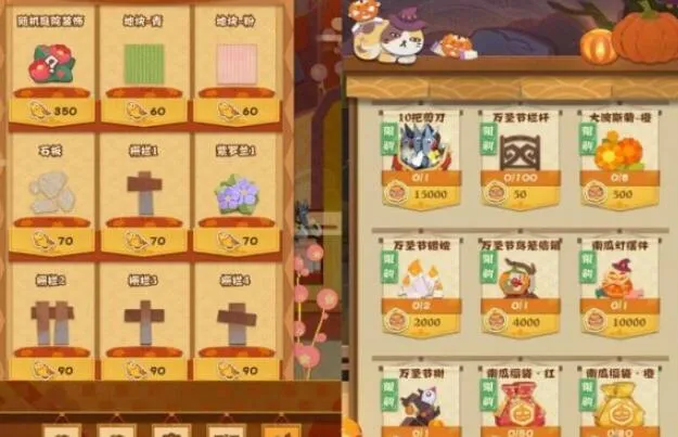 经常玩游戏的家主会发现,供玩家在商店中购买的庭院装饰种类其实并不多,只有3种地块、4种栅栏、2种花和一个水面装饰。那么如何获得那些并不常见的庭院装饰呢?其实获得特殊庭院装饰的途径有三种,最常见的途径是通过商店杂货铺购买,我们点击商店的杂货铺,会看到第三排第一个商品,名为随机庭院装饰。其次,通过活动也能获得一些特殊庭院装饰,例如现在正在进行的万圣节活动。除此之外,听说给家主的新宠物胖头鲶喂食小鱼,也有概率获得特殊装饰。