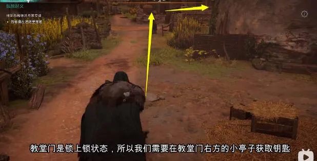 1、沿着下图的路线,直走右转,去教堂前面的亭子拿钥匙;