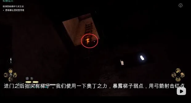 4、开门进去有梯子,打开奥丁之力,射梯子上面的红色点,之后沿着梯子往上爬;