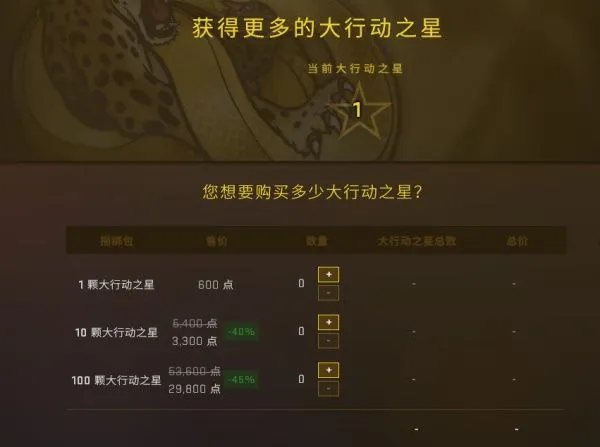 做任务可得大行动之星,每周获取的大行动之星有上限。如果没有时间做任务,你也可以购买大行动之星升级包。购买并激活后,可以获得1/10/100个大行动之星,并拿到相应奖励,但不会影响行动币等级。