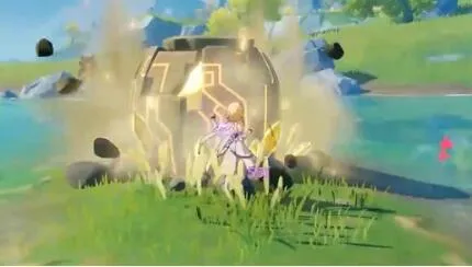 玩家来到宝箱位置,后有个圆盘,是个压力机关,需要使用岩属性角色来开启机关