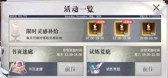 此外游戏中还有限时灵感补给活动,小伙伴们每天可以限时获得灵感补给,分别是在早、中、晚三个时间段,一共可以领到150点灵感。