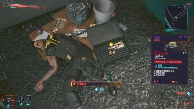 四季宝在主线任务中完成偷走relic芯片的任务之后就可以获得了,这把武器在海伍德的一个小巷子里,和其他的任务一样是用一个黄色的感叹号标记出来的,在上图的位置中,一个尸体的旁边就可以捡到了,四季宝有两种射击模式,一种是射四肢的非杀伤性模式,一种是锁头的冷血模式,而且想要使用这把枪的自动瞄准的话还需要去义体医生那里更换手掌的义体,更换为一个支持智能瞄准的义体就好了,和歌子赠送的那个义体就可以使用。
