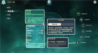砂糖,一个初期被玩家低估,错过后才发现真香的角色。命之座方面没啥好说的,六命解锁完整体,混元熵增论,大招触发扩散反应时,全体增加对应元素20%的伤害加成。此外,固有天赋,小小的慧风,技能命中时全队分享砂糖20%的元素精通。身为法师还能带讨龙,再度增伤。