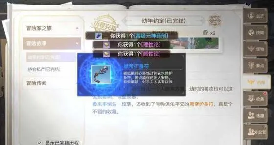 以上就是天谕手游幼年约定任务流程攻略的全部内容了,希望能对大家有帮助,完成任务后能获得冒险藏品【黑帝护身符】哦~大家赶紧去试试吧!