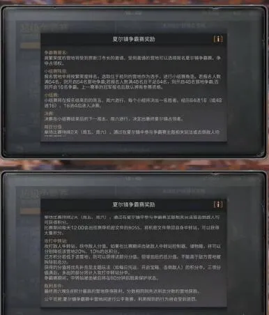 争霸赛是星期五和星期六俩天,星期五早上十点才分配好位置,左下游艇的位置是最好的,十点开始,九点五十就要集合好营地的人进入夏尔,装备有能力最好多备一件,帽子多备几个,帽子是很容易坏的。包括红绿零卡食物赋能临时配件这些都是要提前准备好。夹子是非常有用的,一般一个人提前制作俩组夹子。