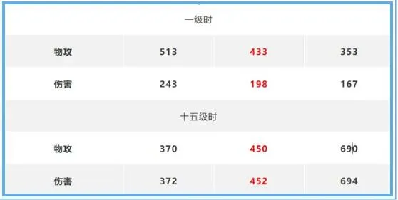 较为明显例子就是一级时物攻为433,能造成的伤害为198;而十五级时物攻为450,能造成的伤害却为452,两者物理攻击力相差不多,实际伤害却相差了一倍有余。