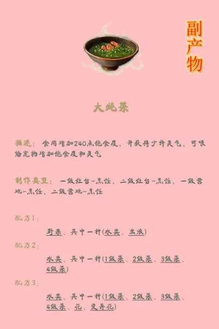 这类食谱均为一级营地或灶台壹制作,产物随机获得,不保证100%获得食谱中所列食物名,但副产物(即可能产生的其他食物)众多,且所获BUFFA较为实用,均为应对各种环境所需,eg,下雨时会因为受潮降低负重,可用于减少潮湿度等。