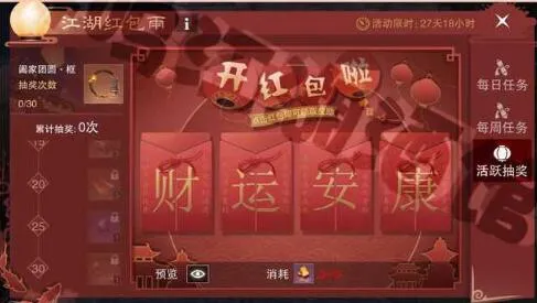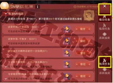 任务分为每日任务和每周任务,完成任务即可获得灯笼进行抽奖每日任务一个任务5个灯笼,每周任务一个任务20个灯笼,这样每周任务全部完成可获得125个灯笼,这样两个半周就可以拿到头像框截止到活动截止公可拿到580个灯笼