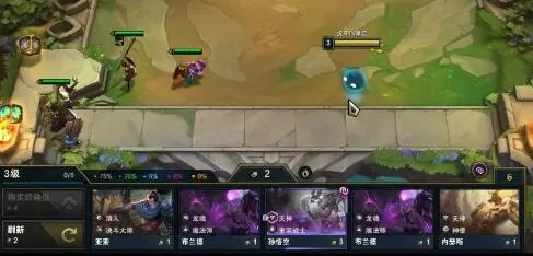 在2阶段野怪后,我们就需要看装备与猴子数量,如果只有3-4只猴子摩昂是不建议继续赌下去的,这样如果猴子来的晚,在3阶段就容易开始无法稳血,阵容强度上会差很多。这局摩昂野怪后有6只猴子就可以继续赌下去,利用50块金币外的利息进行D卡找三星猴子。